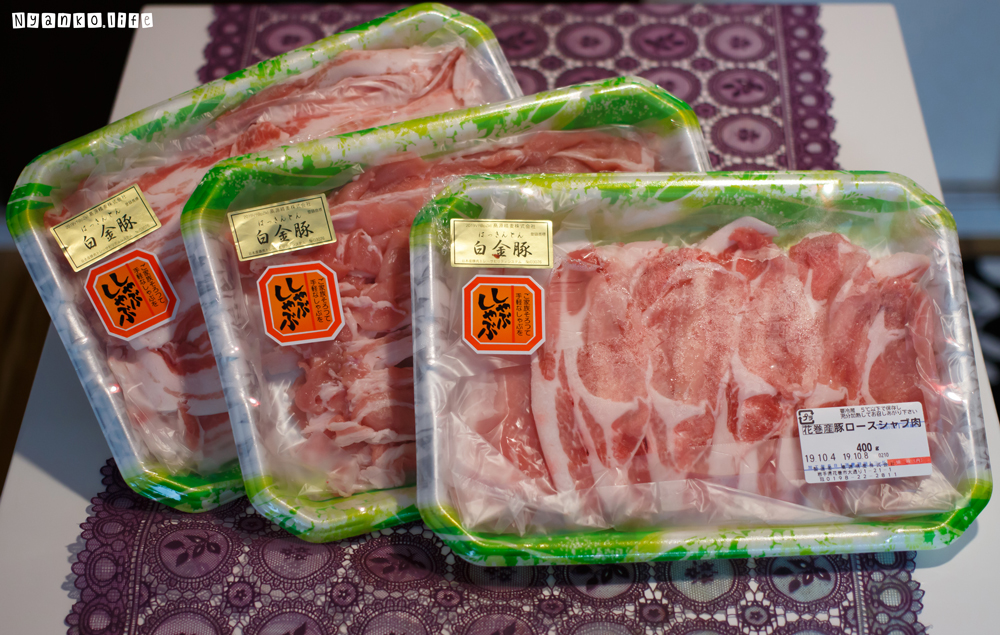全てしゃぶしゃぶ用にカットされている。内訳はロース、バラ、モモの3種類。それぞれ400gで計1.2kgの大ボリューム!